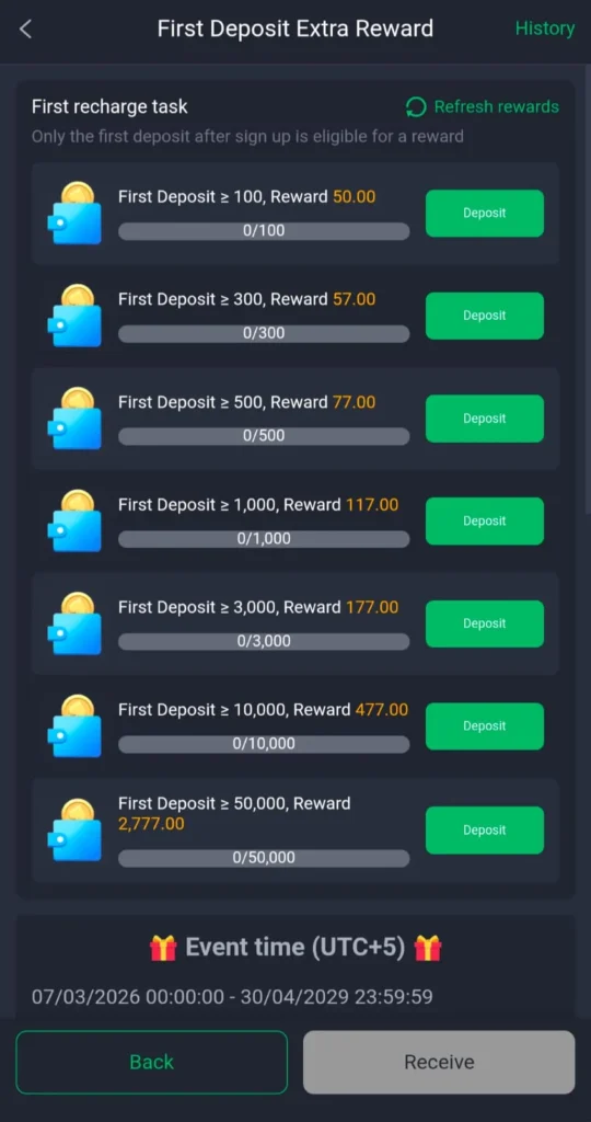 - Go to the Wallet / Deposit Section – Look for the Deposit or Wallet icon in the menu.